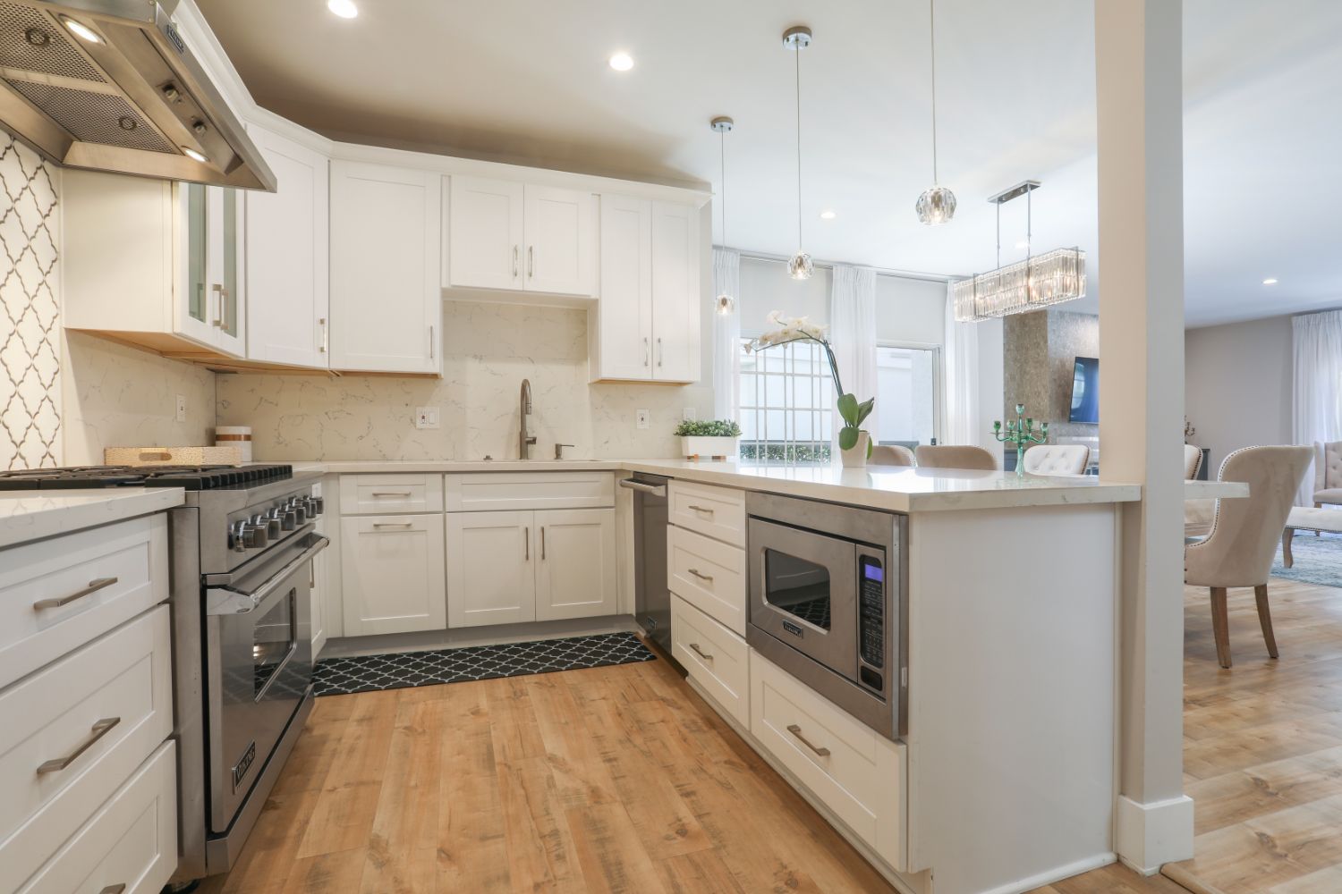 Stunning Custom-Designed Modern Unit, Totally Gutted & Remodeled With The Finest Materials From A To Z, Done To Perfection Ready For The Most Discriminating Of Buyers With All Brand New Systems In Desirable Prime Corner Location. High Ceilings, LED Lightings & Balconies In Every Room With Elaborate Floor To Ceiling Sliding French Doors For Plenty Of Natural Light, Including Dining, Living & Both Bedrooms. Bright & Spacious Living Room With Fireplace, Elegant Wine Closet & Bar And Adjoining Dining Room With A Sprawling Open Floor Concept Are Perfect For Entertaining. The New Large Gourmet Kitchen Is Complete With Viking Appliances Including Professional Viking Range Hood, Farmer Sink, Abundant Cabinetry & Magnificent Oversized Eat-In Island Breakfast Area. The Private Master Bedroom Suite Is Elegantly Spacious With A Delightful Balcony, Customized Walk-In Closet & Luxurious Spa-Like Bath With Double Sinks, Separate Shower/Marble Bench, Bathtub, Illuminated LED Mirror, Bluetooth Speaker, Fan & Colorful light. Beautiful Modern Hallway Bathroom Has A Steam Shower, Bidet & Bluetooth Speaker, Fan & Colorful light As Well. Laundry Area With Quartz Countertop For Folding, Electric Outlet For Ironing & Full Custom Cabinetry On Top For Extra Storage Space. Every Inch Even All The Walls Have Been Renovated With Top Quality Finishes & Fixtures. Enjoy The Tranquil large Pool & Jacuzzi, 2 Car Garage Parking, Extra Storage & Bike Room In The Garage. Once You Are Ready To Venture Out Onto The Town, You Will Find You Have Easy Access To All, Westwood Village Cultural Attractions, UCLA or upscale Century City Outdoor Shopping Mall With world Class Dining, Theaters, Shops And Entertainment Just Minutes Away.